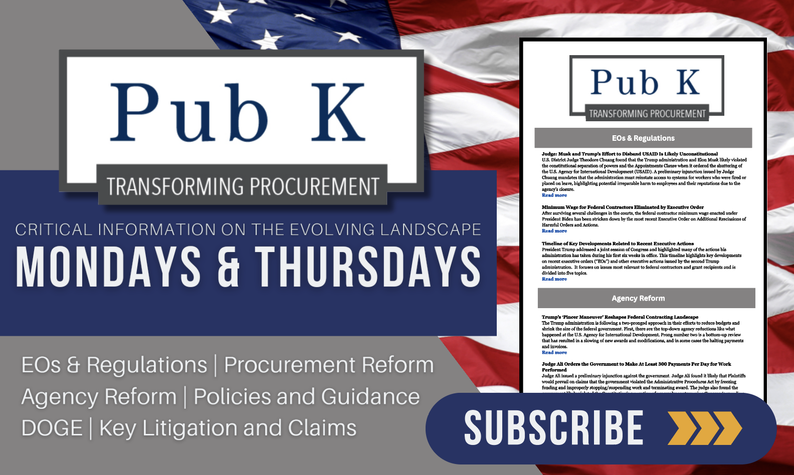 Staying ahead of the curve has never been more important. Our new twice-weekly Transforming Procurement newsletter covers the Trump Administration’s fast-paced, sweeping changes to the federal procurement system. To keep up with these rapidly evolving developments, subscribe to Transforming Procurement, delivered every Monday and Thursday to your inbox.